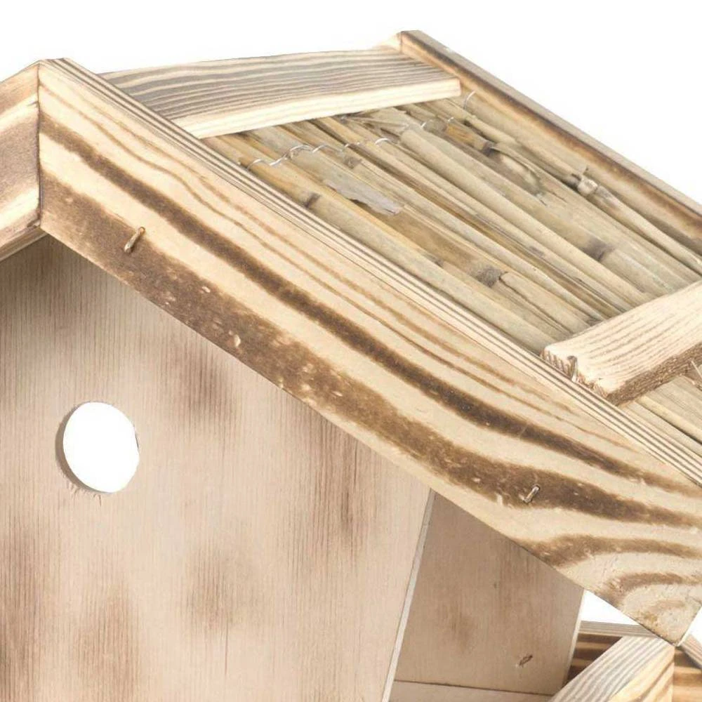 Ein schickes Strohdach schützt den leckeren Inhalt vor Wind und Wetter. Damit Sie und Ihre gefiederten Freunde auch lange Freude am Vogelfutterhaus haben, sollten Sie es einmal im Jahr mit einem feuchten Tuch reinigen.