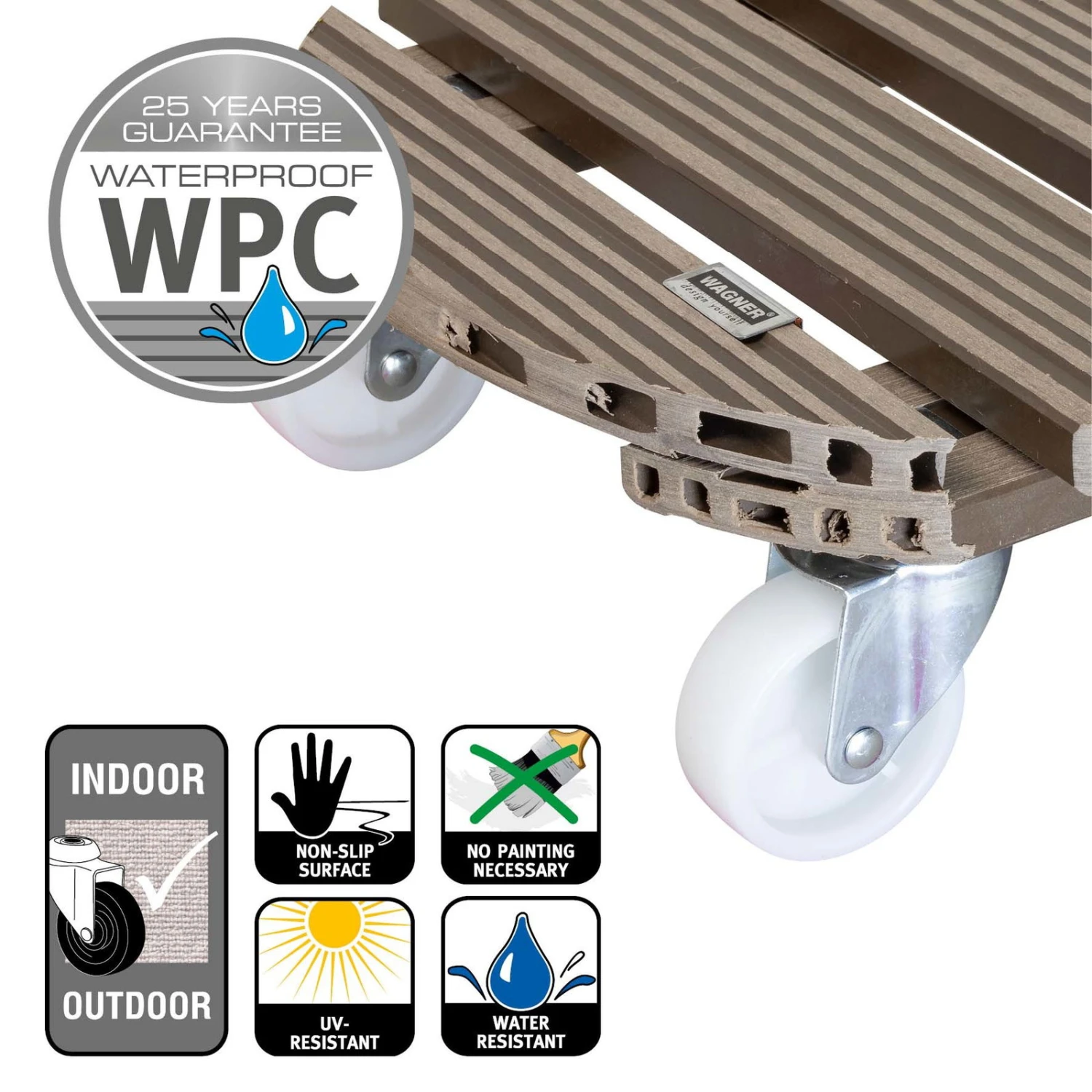 Begrünen Sie Ihre Terrasse oder Ihren Wintergarten mit dem Pflanzenroller auf eine flexible Art. Der Multi Roller in der Farbe Taupe überzeugt nicht nur mit einer hohen Traglast von rund 150 Kilogramm, sondern auch mit seiner strapazierfähigen Oberfläche aus dem Verbundstoff Wood-Plastic-Composite in ansprechender Holzoptik. Das Verbundmaterial ist pflegeleicht, langlebig, wasserabweisend und außerdem farbecht.